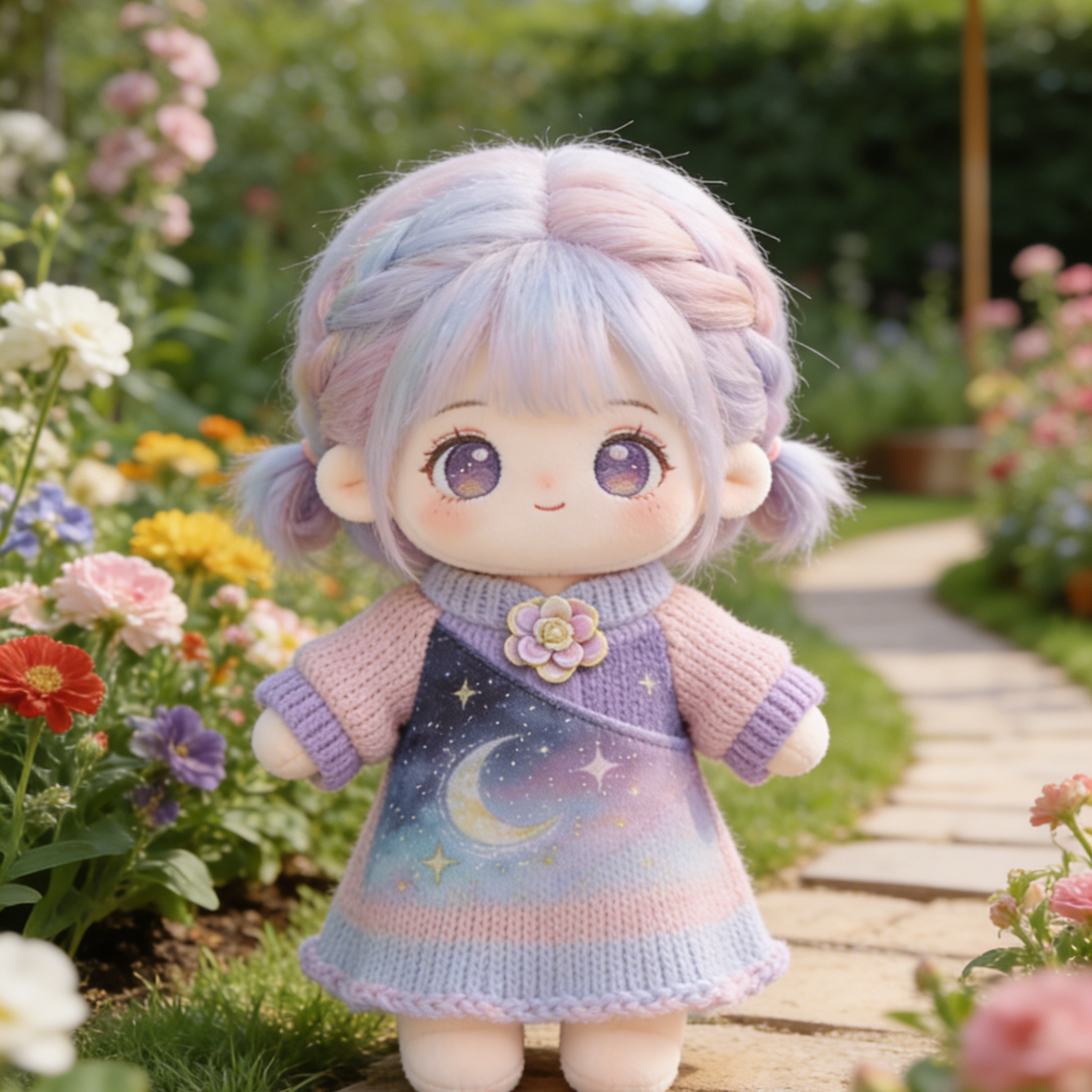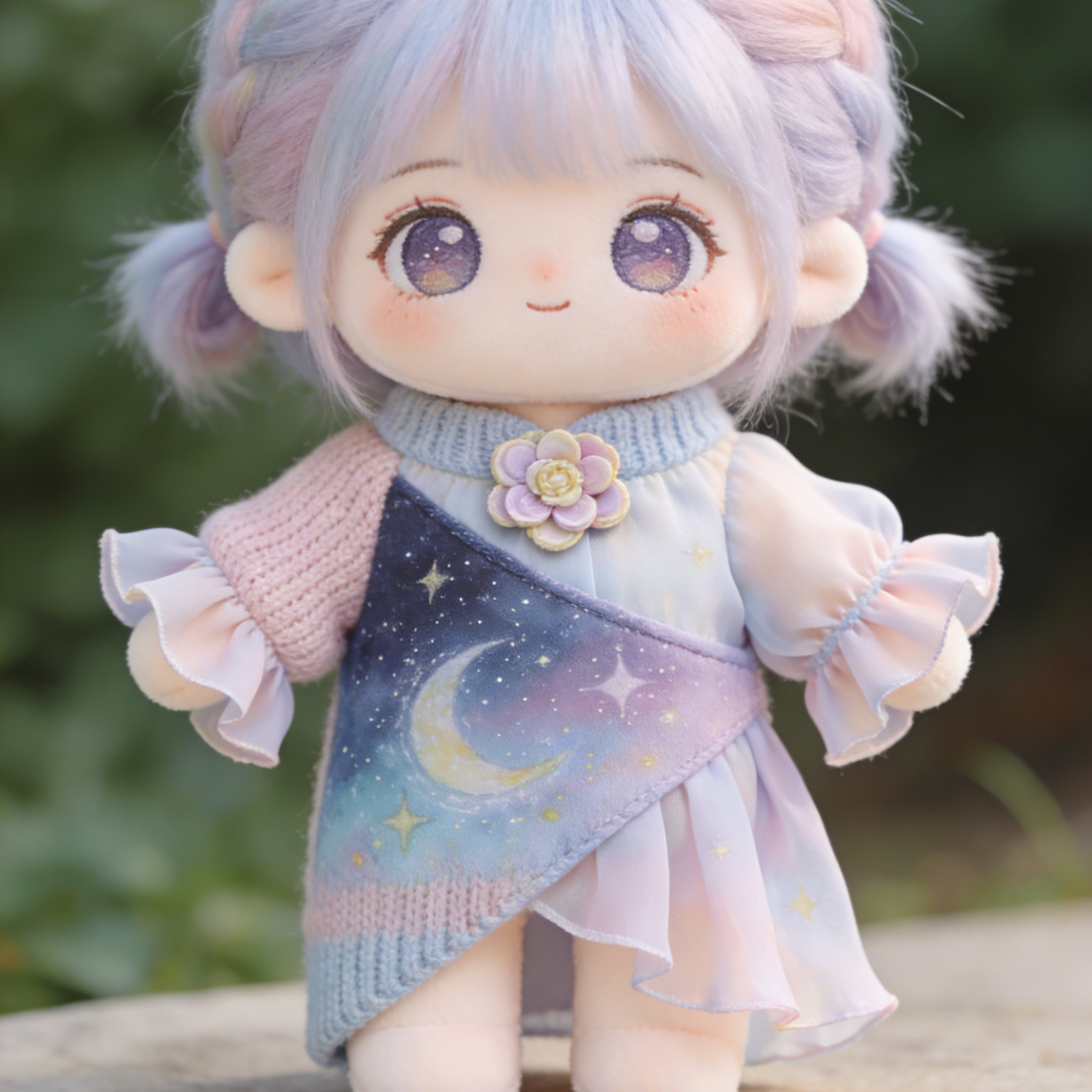 Starry Night Gradient Knit & Chiffon Dress Set - Purple-Blue-Pink Ombre Outfit for 20cm Plush Dolls with Flower Brooch